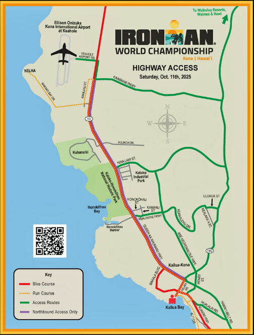 Der Ironman ist für die Einwohner von Kona jedes Jahr ein großes Ereignis. Die mehr als 2000 Athleten verursachen zusammen mit den Familienmitgliedern, den angereisten Zuschauern, Journalisten und Touristen leicht ein kleines Verkehrschaos in der kleinen Stadt. Damit das nicht geschieht, wird regelmäßig eine Karte mit den gesperrten Straßen für den Renntag herausgegeben. Und so groß ist das Chaos auch nicht, weil es sich auf einen einzigen Tag bezieht, bei dem der Highway 19 und einige Straßen im Ort gesperrt sind. Hier ist die Übersicht: