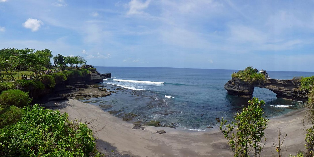 Der Tempel ist links auf dem Bild zu sehen, wohin sich die Touristen auf dem Pfad an der Klippe bewegen. Die Bucht ist auch sehr schön, obwohl die jetzt während der Ebbe nicht so spektakulär aussieht und man zu Fuß zu dem Tempel marschieren kann.
