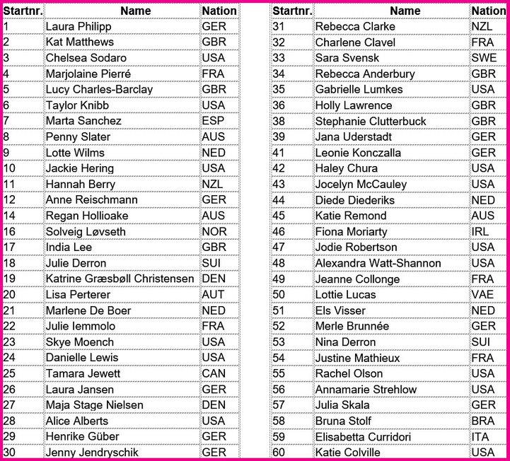 Sie war sogar beim Start zum Marathonlauf an der Spitze, weil Laura Philipp ihre Sonnenbrille und ihr Stirnband verloren hatte und dadurch einige Sekunden einbüßte. Sieben Minuten später folgten die Französin Marjolaine Pierré und die Amerikanerin Chelsea Sodaro, die als starke Marathonläuferin bekannt ist.