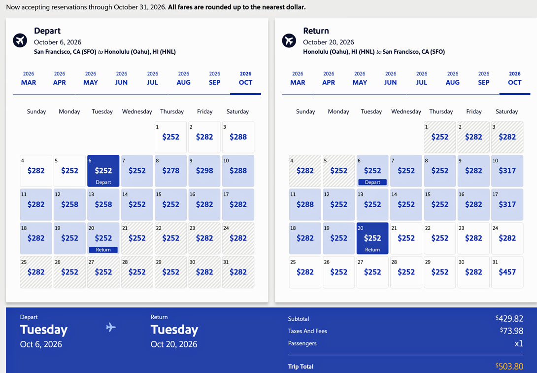 Eine vorteilhafte Ansicht bietet Southwest Airlines, die die Flugpreise in Form einer Tabelle auflistet, damit Sie die günstigsten Tage und Tarife wählen können. Hier zum Beispiel die Preise für die Flüge von San Francisco nach Honolulu und zurück vom Oktober 2026.