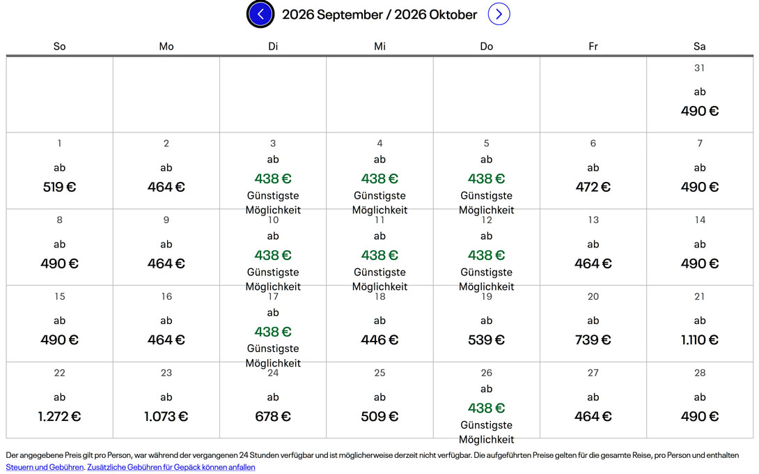 Sie können natürlich noch 90 Euro billiger fliegen, müssen dann aber andere Tage und Flugzeiten wählen. Um die günstigsten Preise und Tage heraussuchen zu können, müssen Sie ein wenig flexibel sein.
