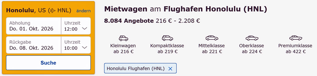 Schauen Sie sich auch die Flugverbindungen von Frankfurt nach Hawaii mit Air Canada über Vancouver an! Es kann durchaus sinnvoll und lohnend sein, nicht über die USA, sondern über Kanada nach Honolulu einzureisen. Die Verbindungen nach Vancouver sind mit der Lufthansa oder besser noch mit Air Canada sowohl in den Flugzeiten wie auch in den Preisen durchaus akzeptabel. Bei einer Buchungsabfrage im Oktober 2025 erreichte ich bei Air Canada folgende Angaben: